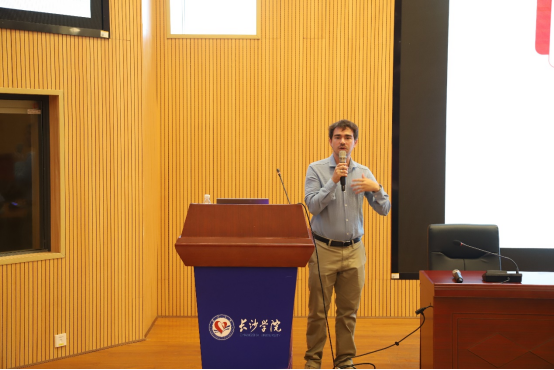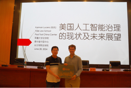 6月28日上午,我院在图书馆二楼学术报告厅举办“美国人工智能治理的现状及未来展望”学术讲座。美国哥伦比亚大学法学院法律博士、美国耶鲁大学法学院蔡中曾中国研究中心研究员、北京大学访问学者Karman Lucero(陆凯)担任主讲人。讲座由法学院副院长龙龙主持,法学院党总支书记胡卉明、院长童伟华,以及法学院两百余名师生一起聆听讲座。会前,校宣传部常务副部长徐远超向Karman Lucero赠送了学校文创礼品。