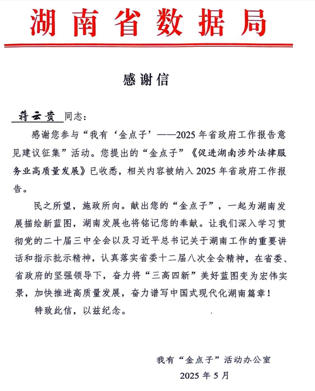 在“我有‘金点子’——2025年省政府工作报告意见建议征集”活动中,我院蒋云贵教授提出的“金点子”《促进湖南涉外法律服务业高质量发展》相关内容被纳入2025年省政府工作报告。该“金点子”提出:在中国(湖南)自由贸易试验区域内设立中外联营律所、外国律所办事处,与外国律所互派法律顾问;建立省级教育、商务、司法行政部门以及省内高校、律所、涉外企业的涉外法律服务人才协同培养机制;构建磋商、调解、仲裁、诉讼相互衔接的涉外纠纷多元协同解决机制。