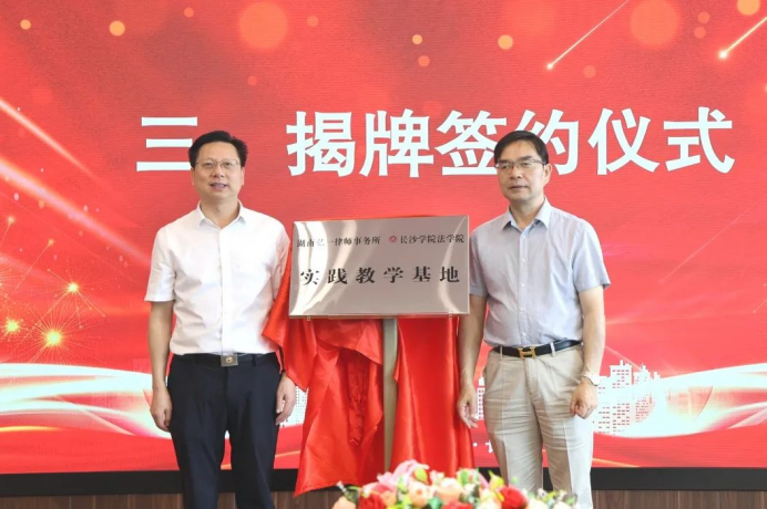 6月12日,长沙学院法学院与湖南弘一律师事务所举行共建实践教学科研基地揭牌签约仪式。长沙学院法学院院长、校学术委员会委员童伟华,法学院副院长韩敬、法学院副院长龙龙、法学院民商法教研室主任韩晗,校学术委员会委员、民商法方向带头人蒋云贵,以及弘一律所党委书记、决委会主席委员陈宏义,律所党委委员、管委会委员李咸武,律所党委委员、监事会监事盛金良,律所管委会委员覃巨石,律所第二支部书记、战略发展与外联工作委员会主任喻孟良,律所第四支部党建专干陈德勇出席仪式。