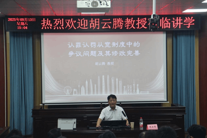 9月13日下午,著名法学家、最高人民法院咨询委员会委员、中国法学会案例法学研究会会长、博士生导师、原最高人民法院审判委员会专职委员、二级大法官胡云腾教授,莅临我院举办“认罪认罚从宽制度中的争议问题及其修改完善”讲座。湖南省高级人民法院副院长彭卫兵、我校党委委员、纪委书记丁文、中南大学法学院张杰教授、湖南师范大学法学院赵冠男副教授、法学院师生、省市司法部门代表共百余人聆听了报告。法学院院长童伟华教授主持学术报告会。