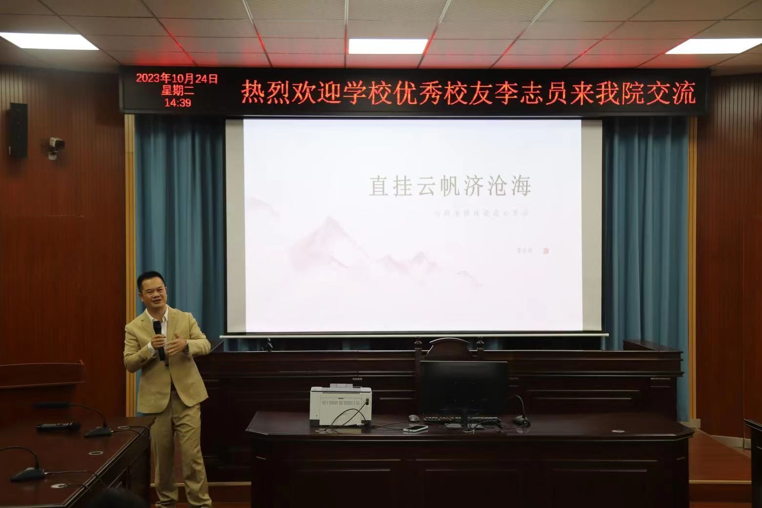 活动伊始,李志员主任以风趣幽默的方式,从亲身经历入手,带领同学们进入今天的话题。他讲述了自己与母校过往的点点滴滴,从专业学习、师生关系、室友关系、学校伙食等细节方面进行分享,引起了在座同学的共鸣,增强了大家对学校、学院的归属感与认同感。