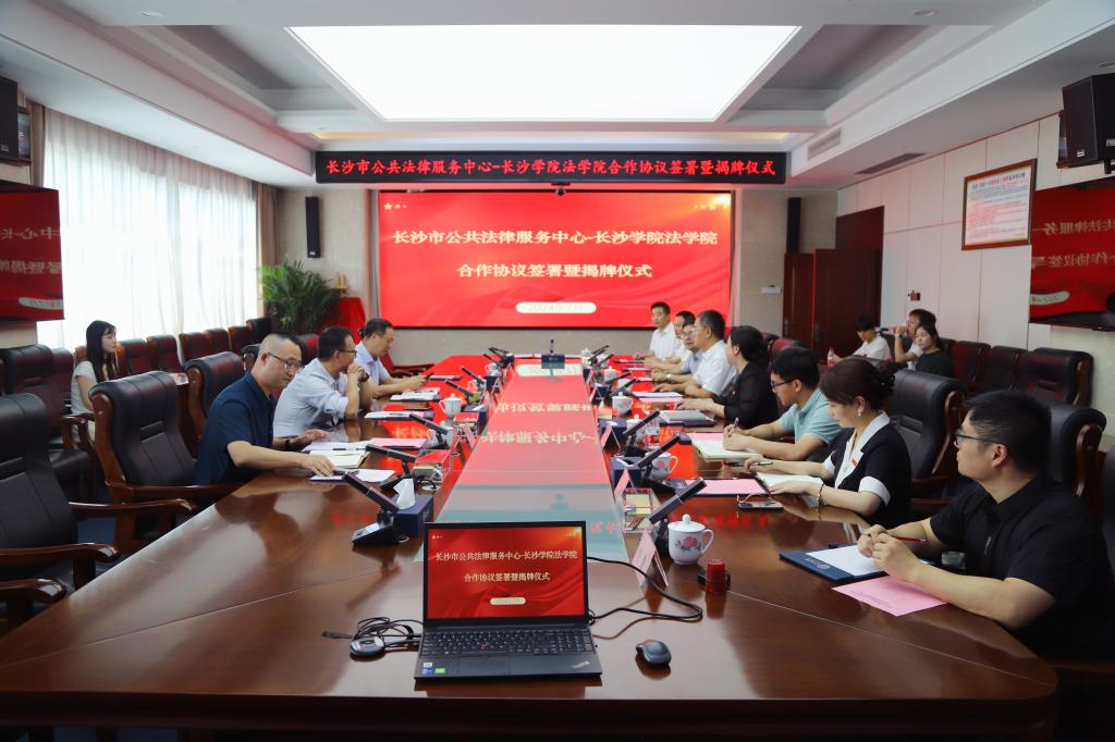 7月5日上午,长沙市公共法律服务中心与法学院在学校长盛楼4001会议室隆重举行合作协议签署暨揭牌仪式,双方在法律服务、人才培养、学术研究等领域的合作正式拉开帷幕。长沙市司法局党组成员、副局长王剑,长沙市公共法律服务中心主任李喆,长沙市司法局公共法律服务管理处处长黄坤浩等莅临现场,学校党委委员、副校长张世英,法学院党政班子成员及教师代表参加了这次活动。