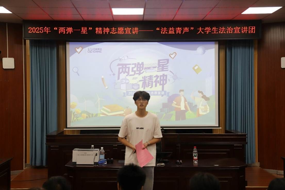 为传承和弘扬“两弹一星”精神,引导新时代广大青年学生坚定爱国报国信念,2025年10月15日晚上,法学院“法益青声”大学生法治宣讲团在模拟法庭,为大一新生带来了一场主题鲜明、内容生动的“两弹一星”精神志愿宣讲活动。