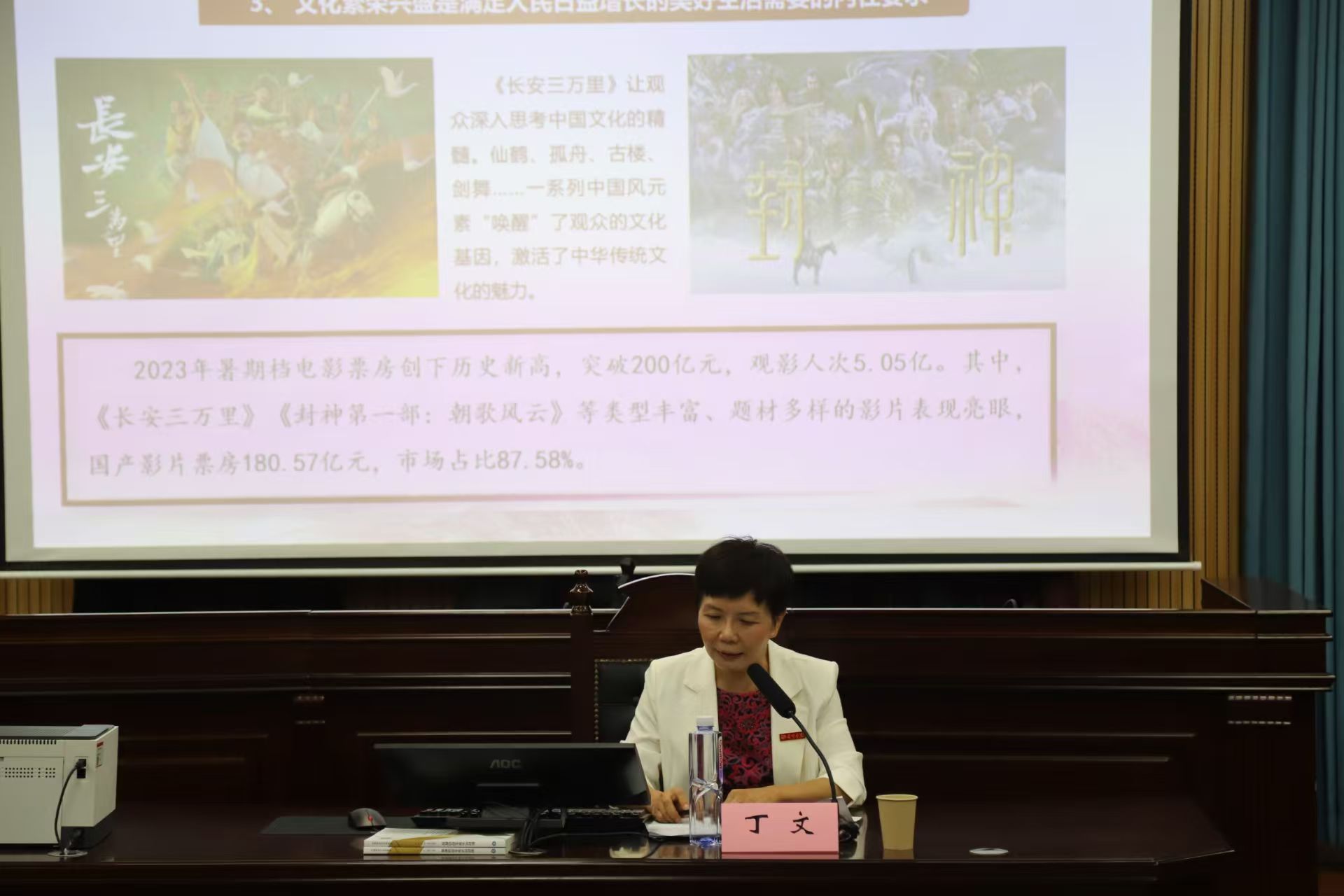 授课过程中,丁文结合丰富的优秀文化实例,将理论与实践深度融合。她先是阐释文化繁荣对民族复兴的重大意义,强调优秀文化产品在满足人民精神需求、增强国家国际影响力中的积极作用;随后深入分析意识形态工作的极端重要性及面临的挑战,着重强调坚持马克思主义在意识形态领域指导地位的根本制度,以及依法加强网络空间治理、培育践行社会主义核心价值观的必要性;最后围绕提升国家文化软实力的具体举措,提出要繁荣发展文化事业与文化产业,讲好中国故事、传播好中国声音,并借鉴成功经验推动中华优秀传统文化创造性转化、创新性发展。