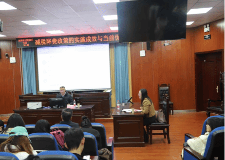 12月30日上午,国家税务总局湖南省税务局科研所副处长、研究员陈懿赟应邀在模拟法庭为我院开展题为“减税降费的实施成效与当前优化”的学术讲座。该讲座由法学院教师韩晗主持,副教授蒋伟龙及23级部分学生参加。