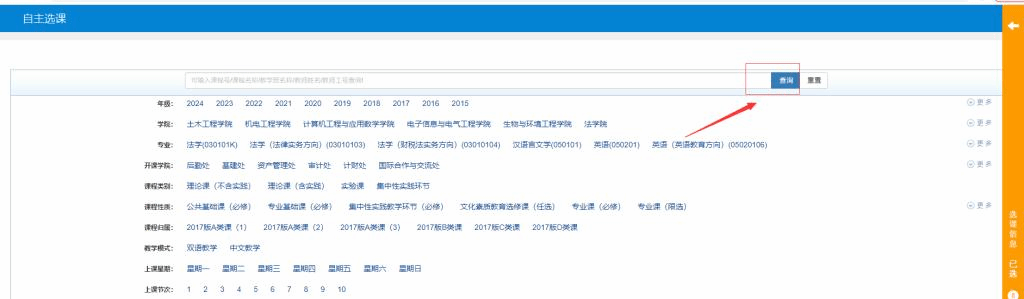 四、在选课界面下,请先点右上角的查询按钮,查询出选课列表(电脑见图6和图7),进行选课和退选(电脑见图8)。