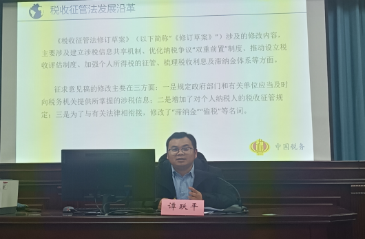 1月2日晚,我院特邀长沙市长沙市芙蓉区税务分局谭跃平公职律师在涵虚楼模拟法庭开展“税收征管法若干问题的理解和适用”专题讲座。本次讲座由法律实务教研室主任韩晗主持,法学院部分教师以及21级全体学生出席参与此次讲座。
