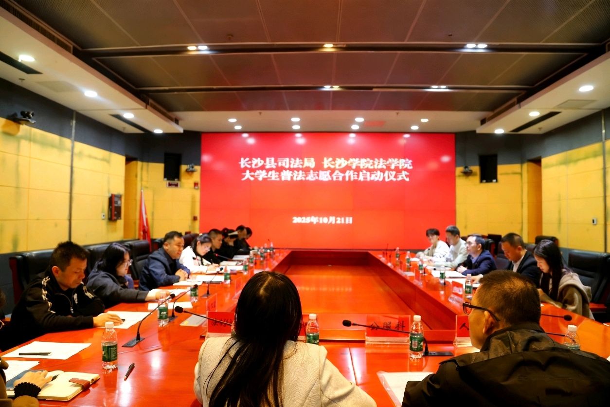 2025年10月21日下午,长沙县司法局与长沙学院法学院大学生普法志愿合作启动仪式在长沙县政务中心隆重举行。本次活动以“专业教研+基层实践”为核心,旨在落实省、市“1名村(社区)法律顾问+1名大学生普法志愿者+N名法律明白人”行动部署,通过整合高校法学专业资源与基层普法实践需求,打造普法宣传新样板。