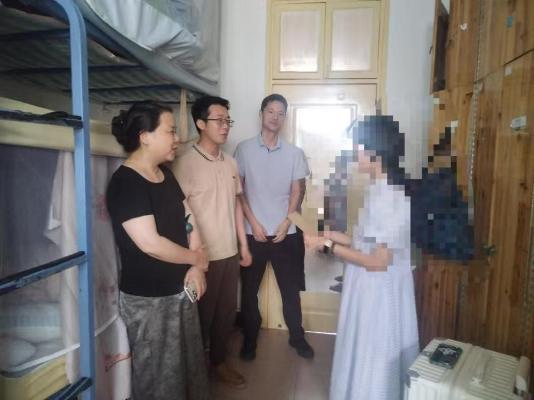 7 月 1 日下午,法学院党总支书记胡卉明、辅导员谭敏捷、张正东一行前往学生宿舍,看望慰问家庭经济困难学生,为他们送去学院的关怀与温暖。在学生宿舍里,老师们与同学们亲切交谈,详细询问了学生近期的学习状况、生活需求以及暑期规划。老师们耐心倾听学生的心声,鼓励学生要树立信心,勇于面对暂时的困难,在学习上刻苦钻研,不断提升专业能力,同时积极参与社会实践活动,全面提升综合素质。