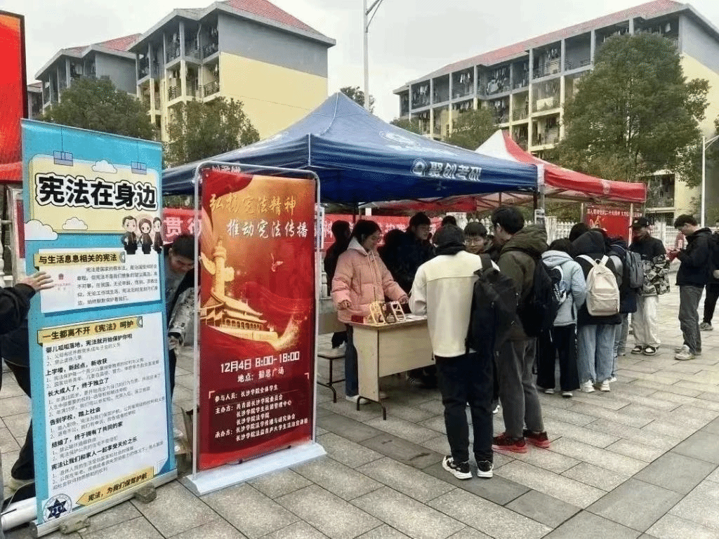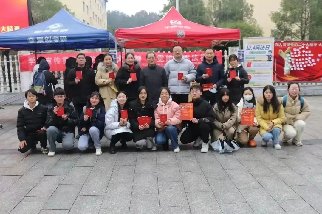 2022年12月4日是第九个国家宪法日,也是中国现行宪法公布施行四十周年。为宣传普及宪法相关知识、加强宪法传播力度、推动宪法深入师生群体,由学校关工委、团委、法学院主办,学生社团管理中心、法学传播与研究协会、法学院法益青声普法团队承办,主题为“学习宣传贯彻党的二十大精神,推动全面贯彻实施宪法”活动,于12月4日在校内举办。本次活动面向全校学生开展,学校关心下一代工作委员会常务副主任杨兴龙,张跃佳、胡卉明、张辉、廖生成、龙龙、姜思源等老师及法协、“法益青声”团队志愿者参加。
