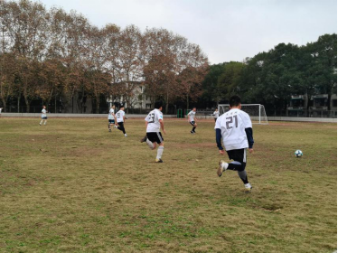 接下来的一场比赛在我院与计算机工程与应用数学学院之间展开。初冬的寒冷阵阵袭来,我院足球队队员身着单薄球衣,热情却丝毫未减。在形势胶着几小时后,计算机工程与应用数学学院首进第一球。但我院队员在队长的领导下及时调整心态,在对方队员进球之后紧接着踢进一球。随着比赛的深入,计算机工程与应用数学学院逐渐抢占上风,我院以1:3的得分落败。
