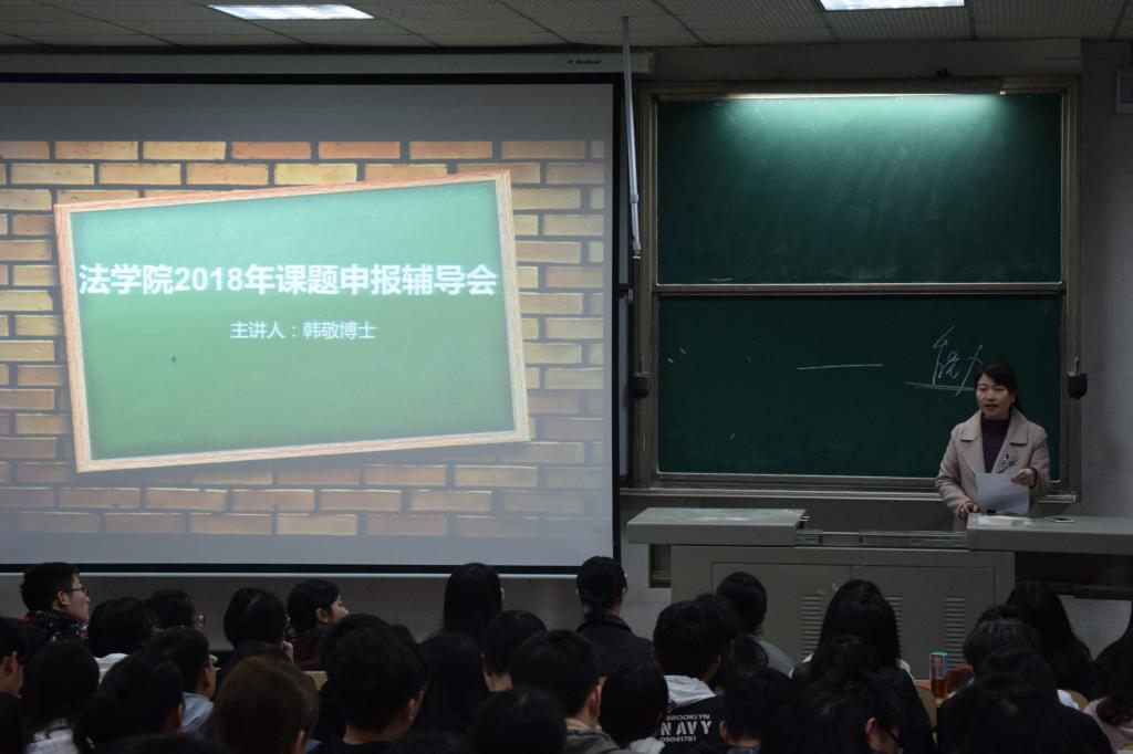 为加强我院课题申报工作,切实提高同学们的课题质量,3月13日晚,我院于涵虚楼A多一教室举办了法学院课题申报辅导会。法学院党总支副书记刘秋菊,学工办主任傅诗贻,辅导员裴昊铭出席了本次大会,韩敬博士担任主讲人,全体16,17级同学到场。