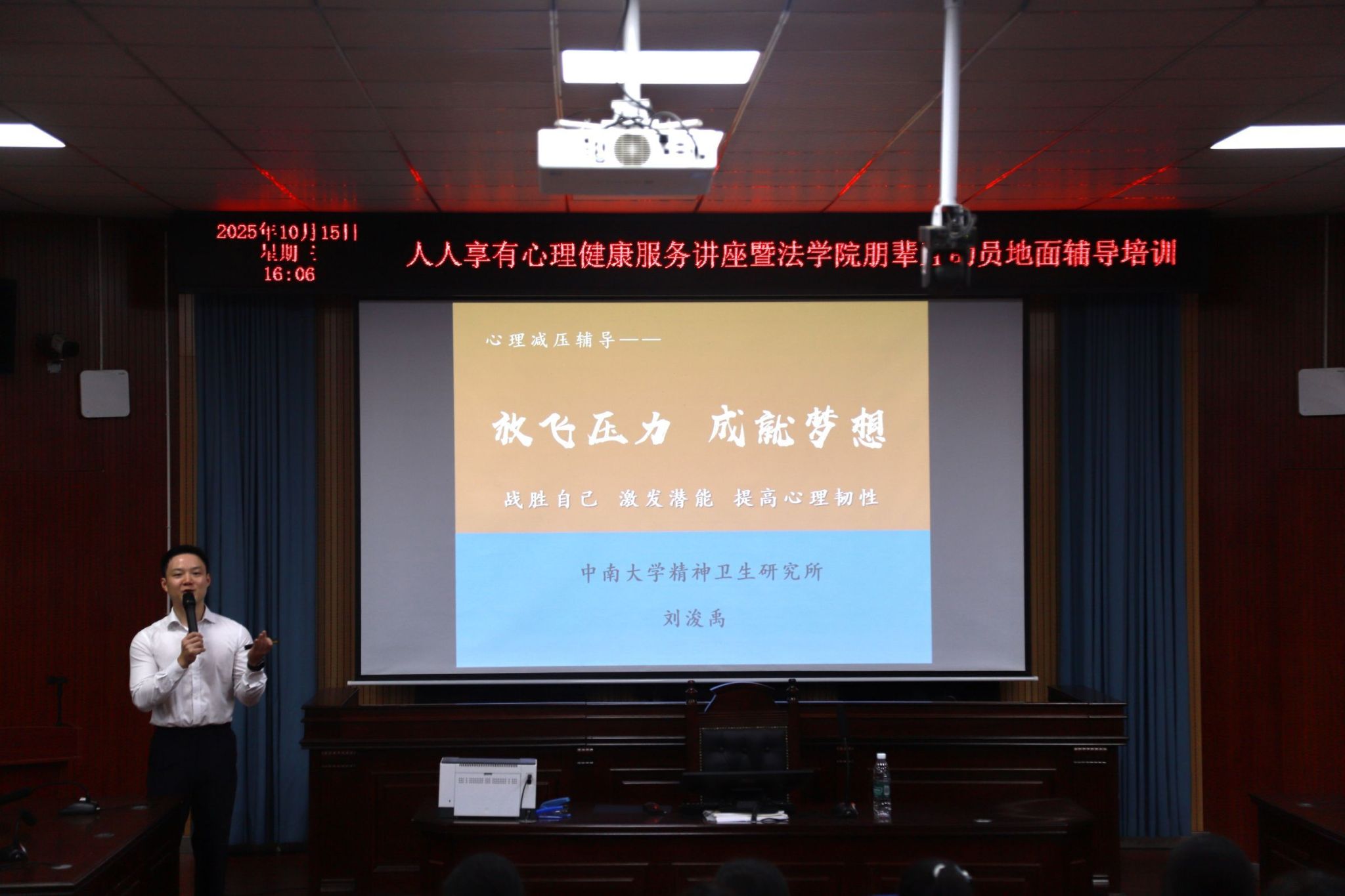 2025年10月15日,长沙学院法学院于涵虚楼模拟法庭成功举办朋辈互助员地面辅导培训会。法学院全体朋辈互助员及其他学院部分学生参与本次培训,中南大学精神卫生研究所刘浚禹担任主讲人,围绕心理健康知识普及与实践指导展开教学,为学生提供专业的心理健康支持。