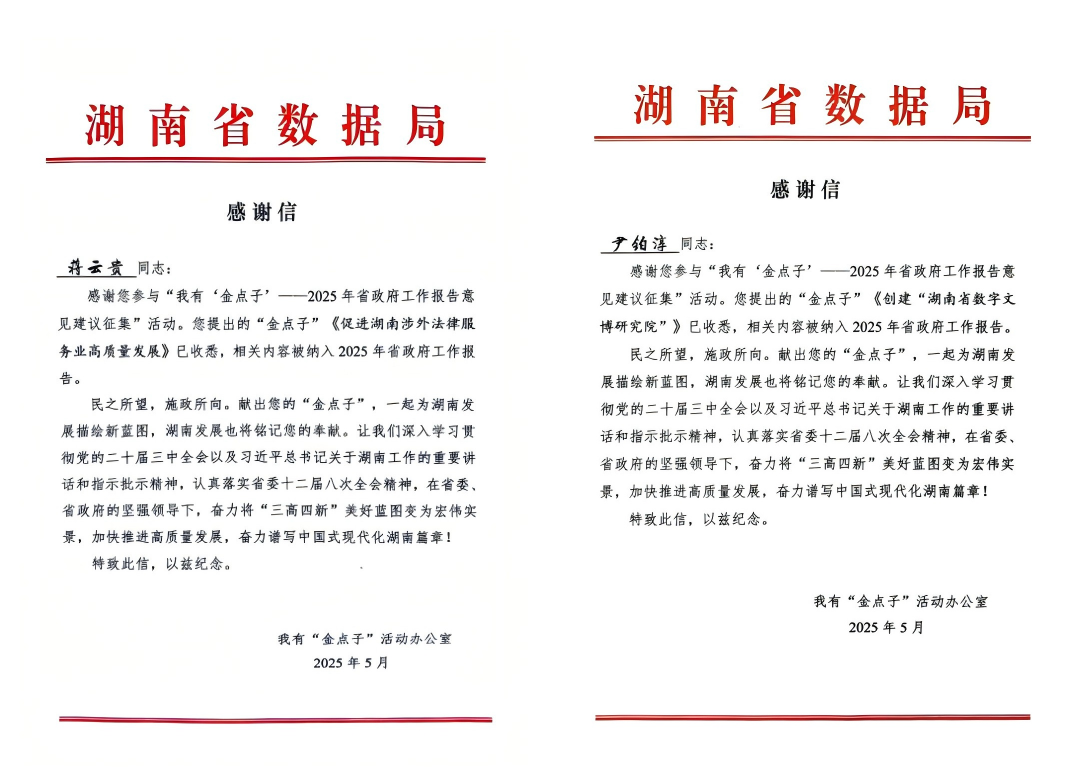 近日,学校收到湖南省数据局我有“金点子”活动办公室发来的感谢信,对我校法学院教授蒋云贵和外国语学院副教授尹铂淳参与“我有‘金点子’——2025省政府工作报告意见建议征集”表示感谢,两位老师提出的《促进湖南涉外法律服务业高质量发展》和《创建“湖南省数字文博研究院”》已被纳入2025年省政府工作报告。
