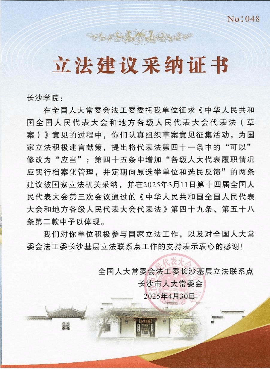 此前,受全国人大常委会法工委的委托,长沙市人大常委会向我校征询《代表法(修正草案)》修改意见,法学院积极组织教师提供高质量的立法建议。其中柳湘和肖雪两位教师所提的两条建议被全国人大正式采纳,并体现在2025年修改后的《代表法》中。这是法学院教师的立法建议第三次被国家立法机关采纳,此前《科学技术进步法(修正草案)》和《学位法(草案)》也采纳了我校立法建议。