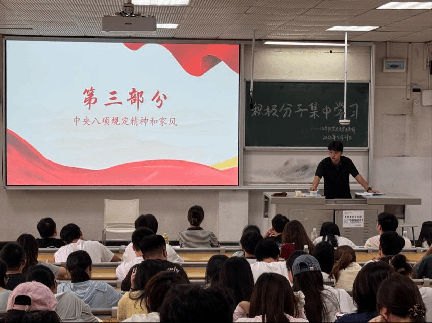 为深入学习贯彻中央八项规定精神,强化作风建设,2025年5月27日下午,法学院党总支学生支部组织入党积极分子开展 “深入贯彻中央八项规定精神” 集中学习活动。活动以 “集中授课 + 分组讨论” 的形式开展,由贺鹏同志担任授课人,部分学生党员及入党积极分子参与此次活动。